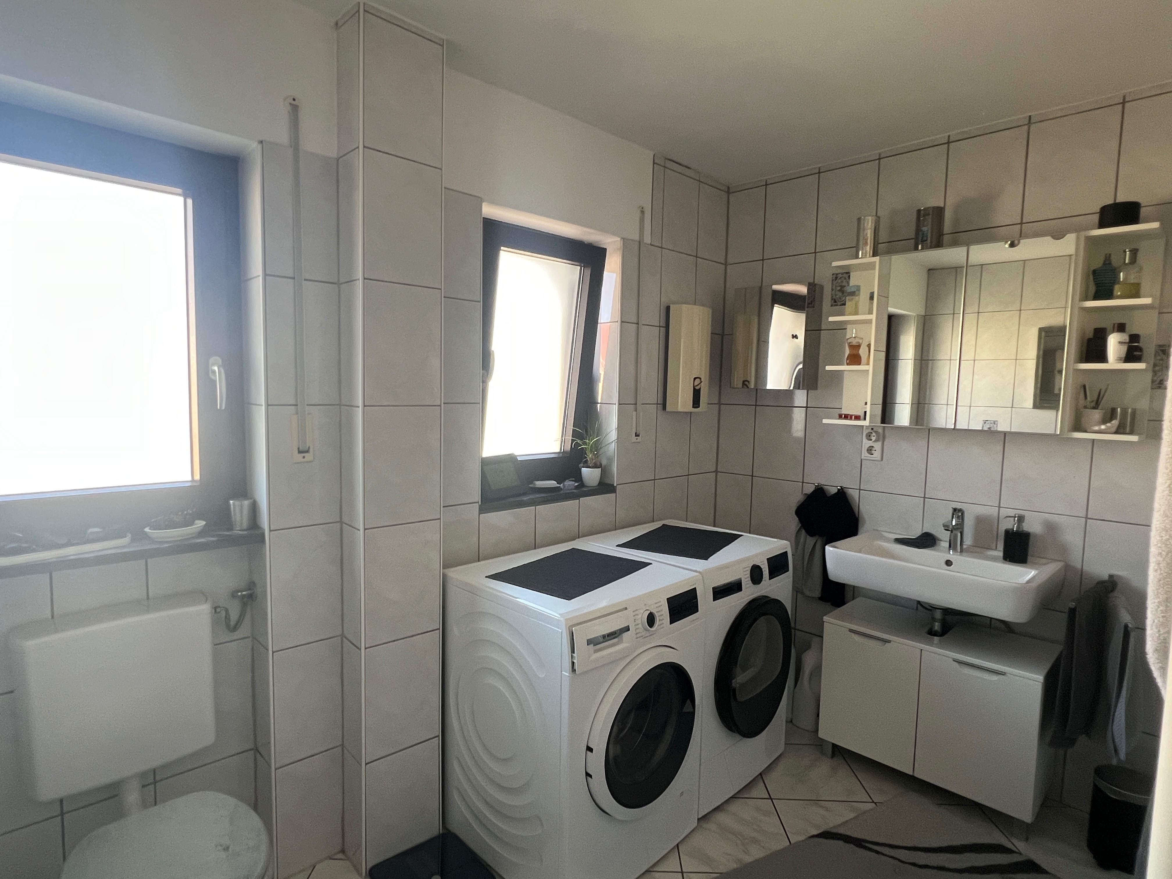 – Bad: Waschbecken, WC, Dusche, Waschmaschinenanschluss