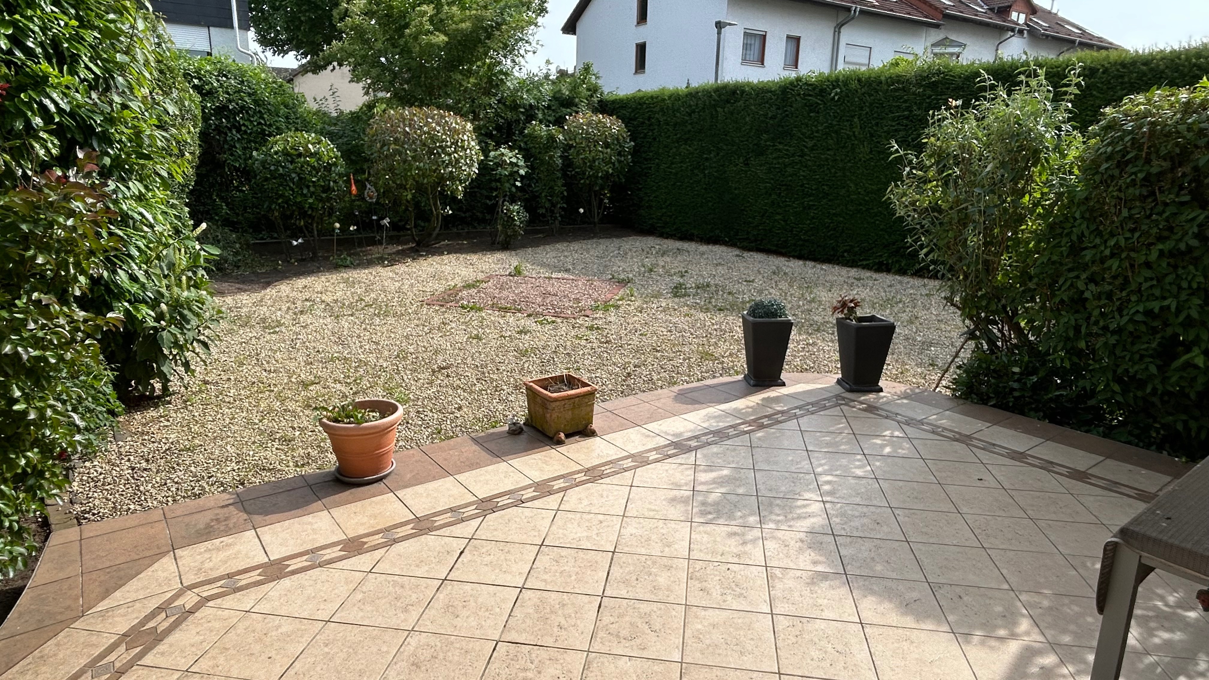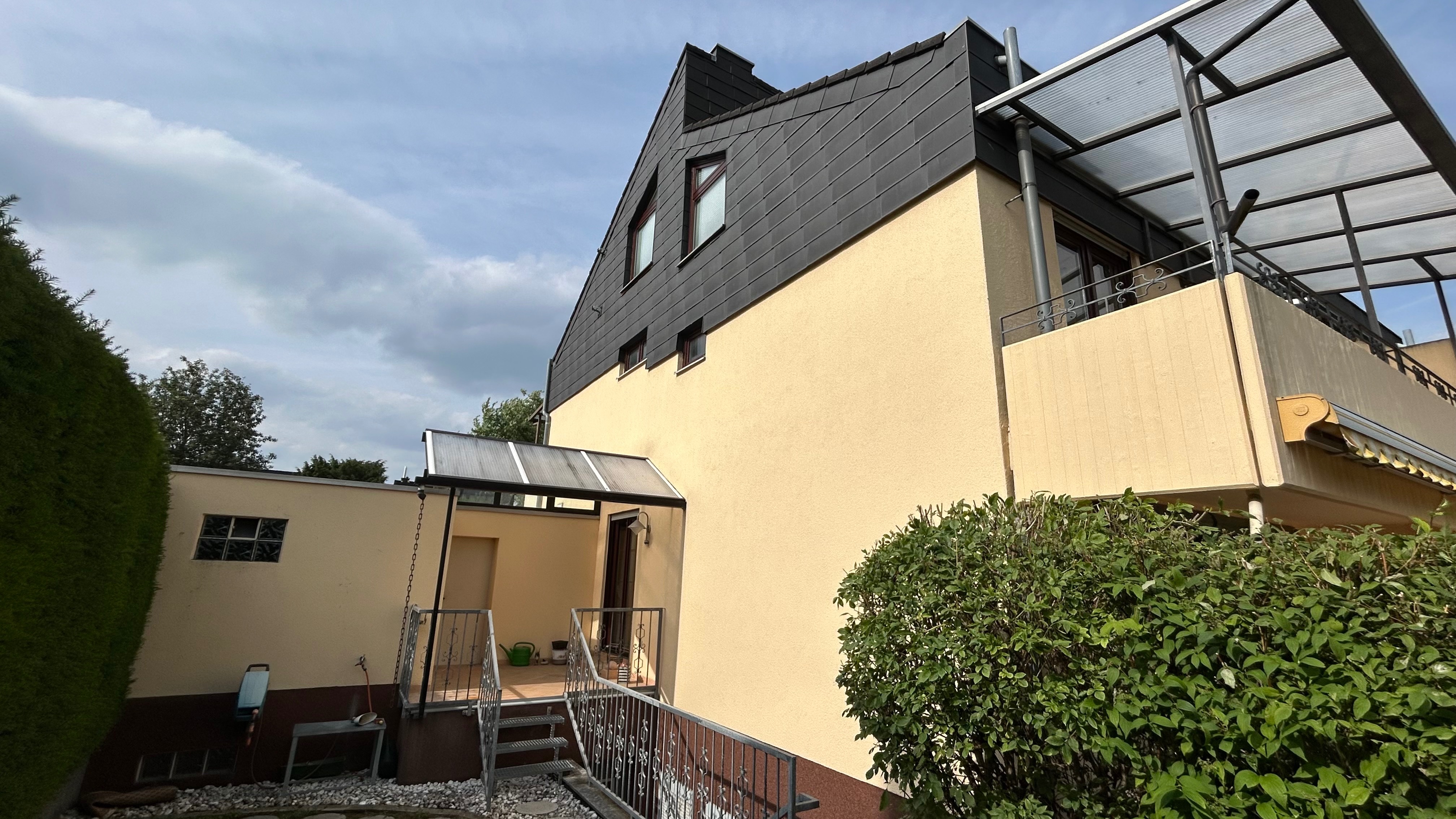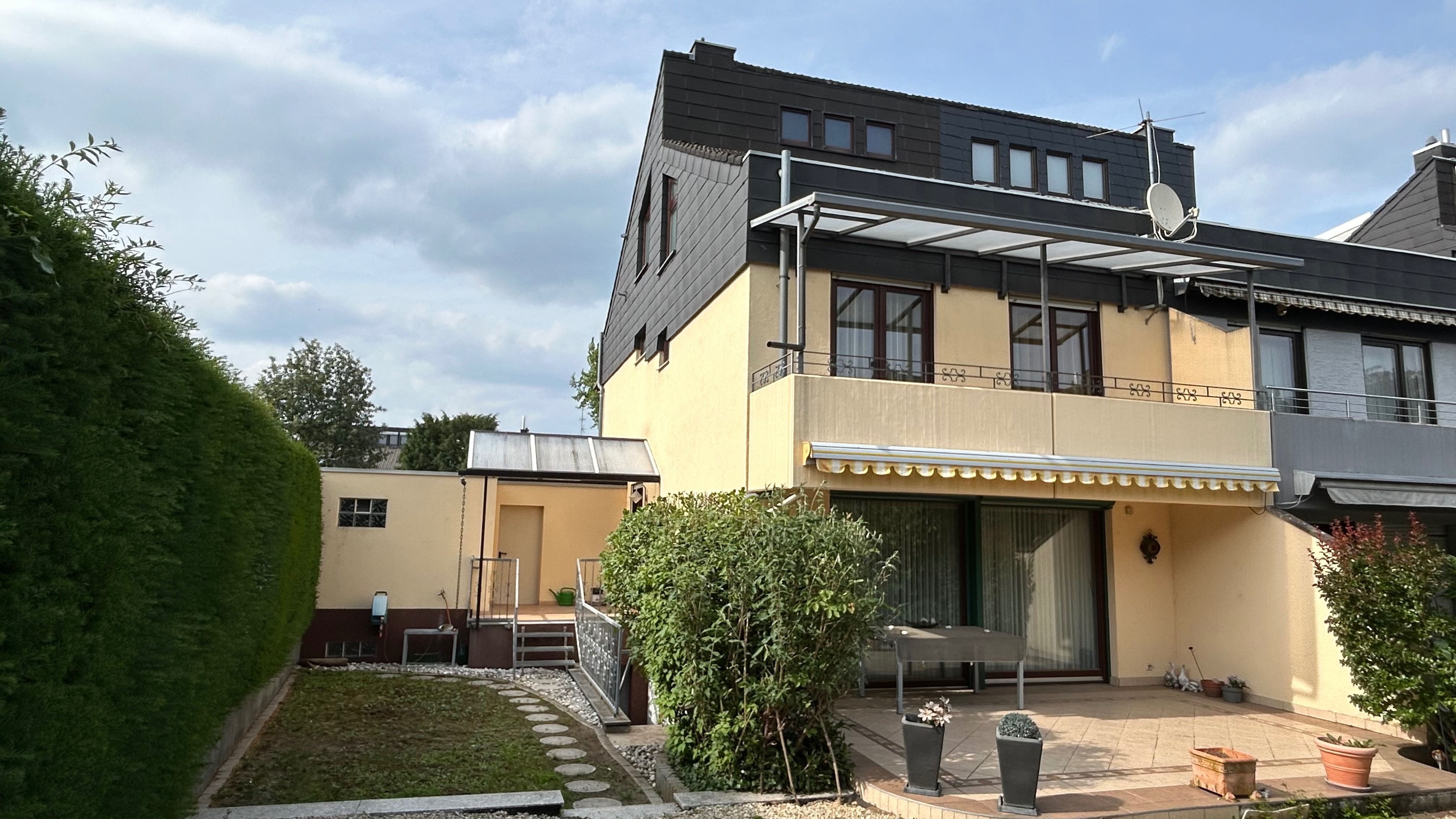 – renovierungsbedürftige Doppelhaushälfte mit großzügiger Hauptterrasse sowie kleine seitliche überdachte Terrasse am Haus mit Durchgang zur Garage