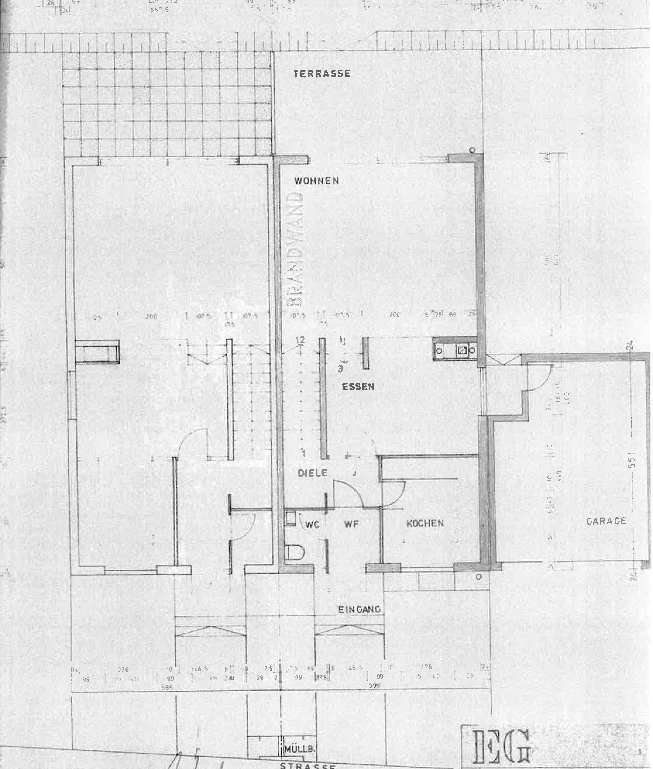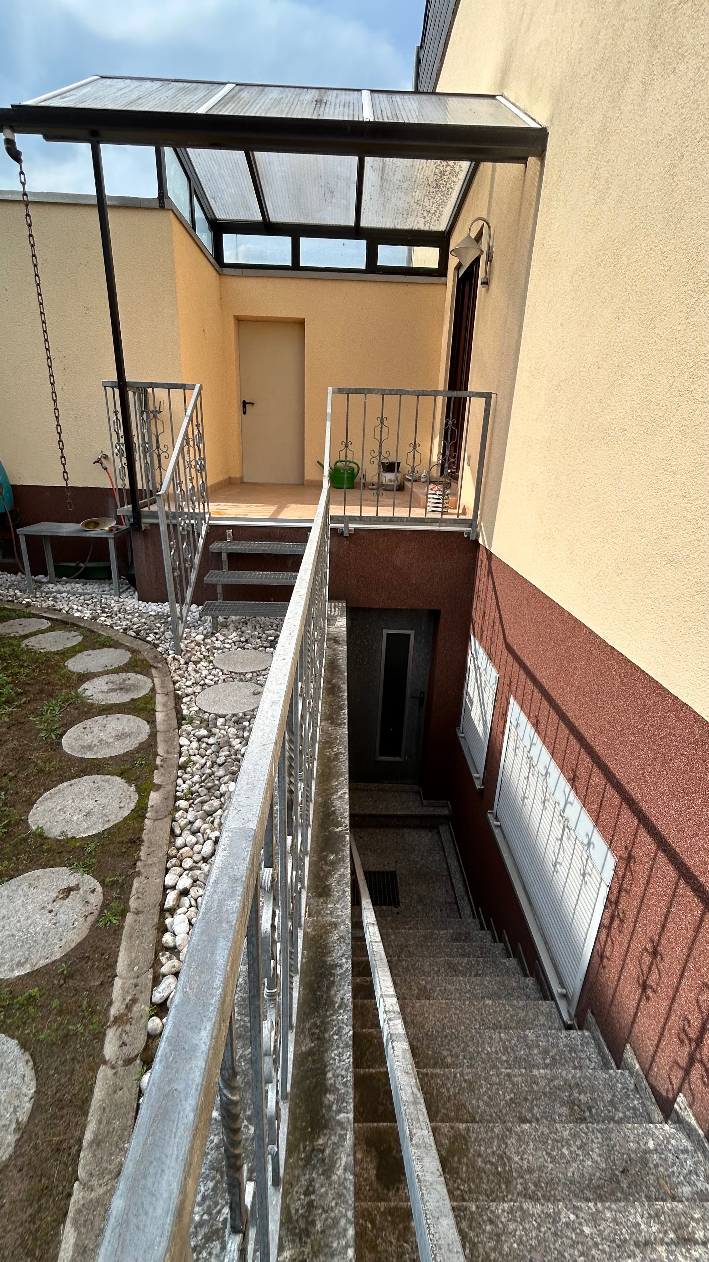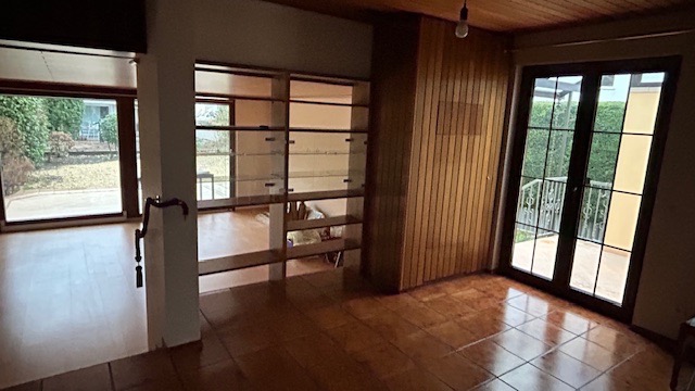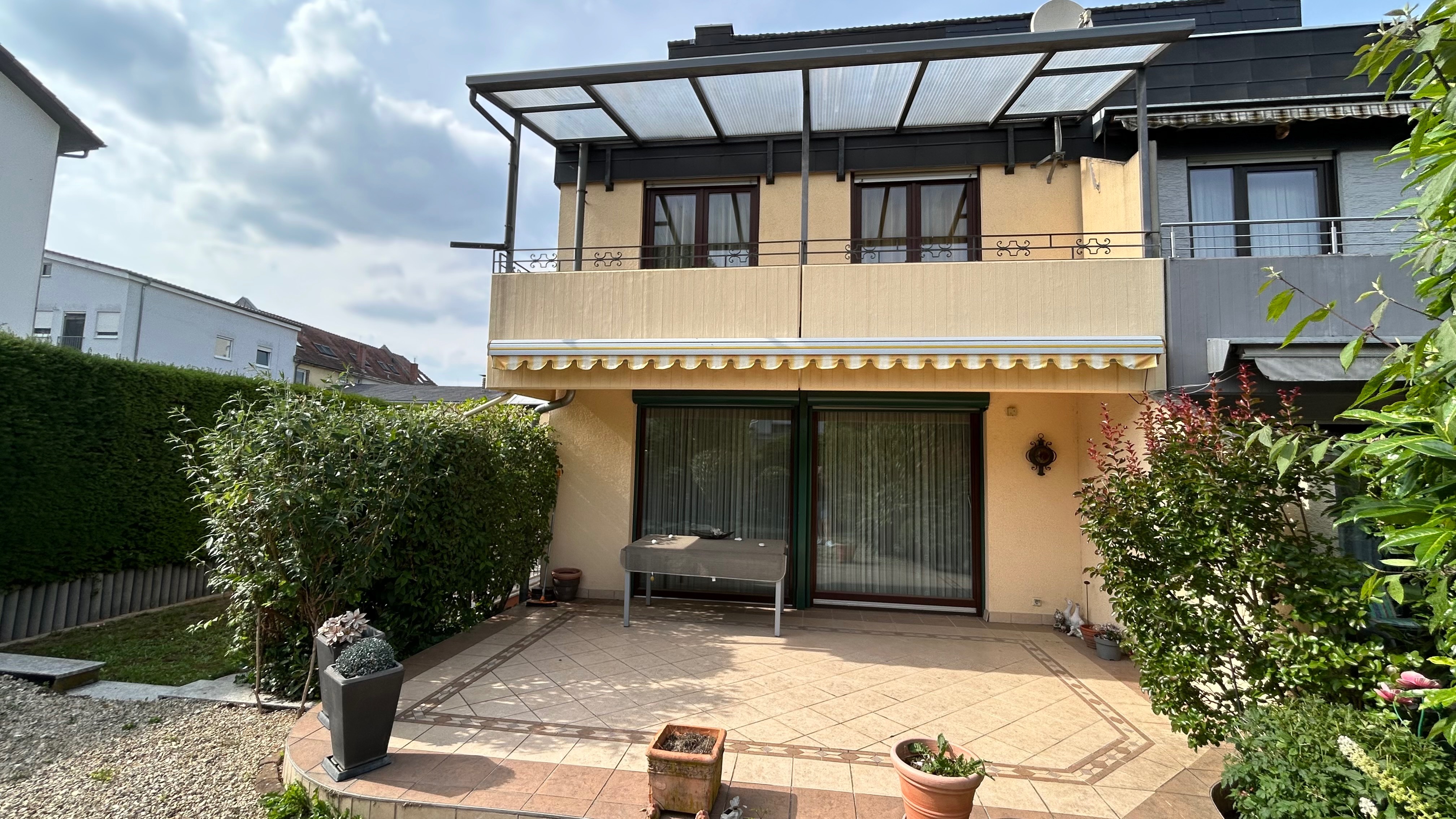 – renovierungsbedürftige Doppelhaushälfte mit großzügiger Hauptterrasse sowie kleine seitliche überdachte Terrasse am Haus mit Durchgang zur Garage